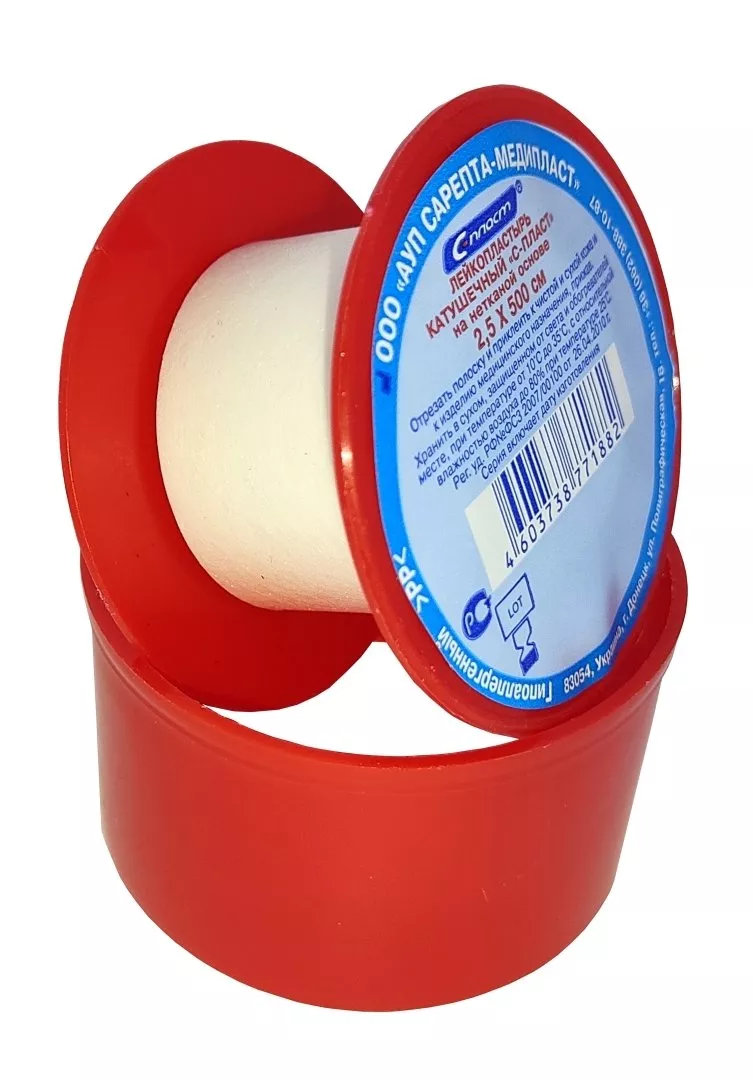 - Лейкопластырь катушечный "С-ПЛАСТ" на нетканой основе 2,5х500 см белый, С-Пласт (пластиковая втулка, пластиковый футляр)