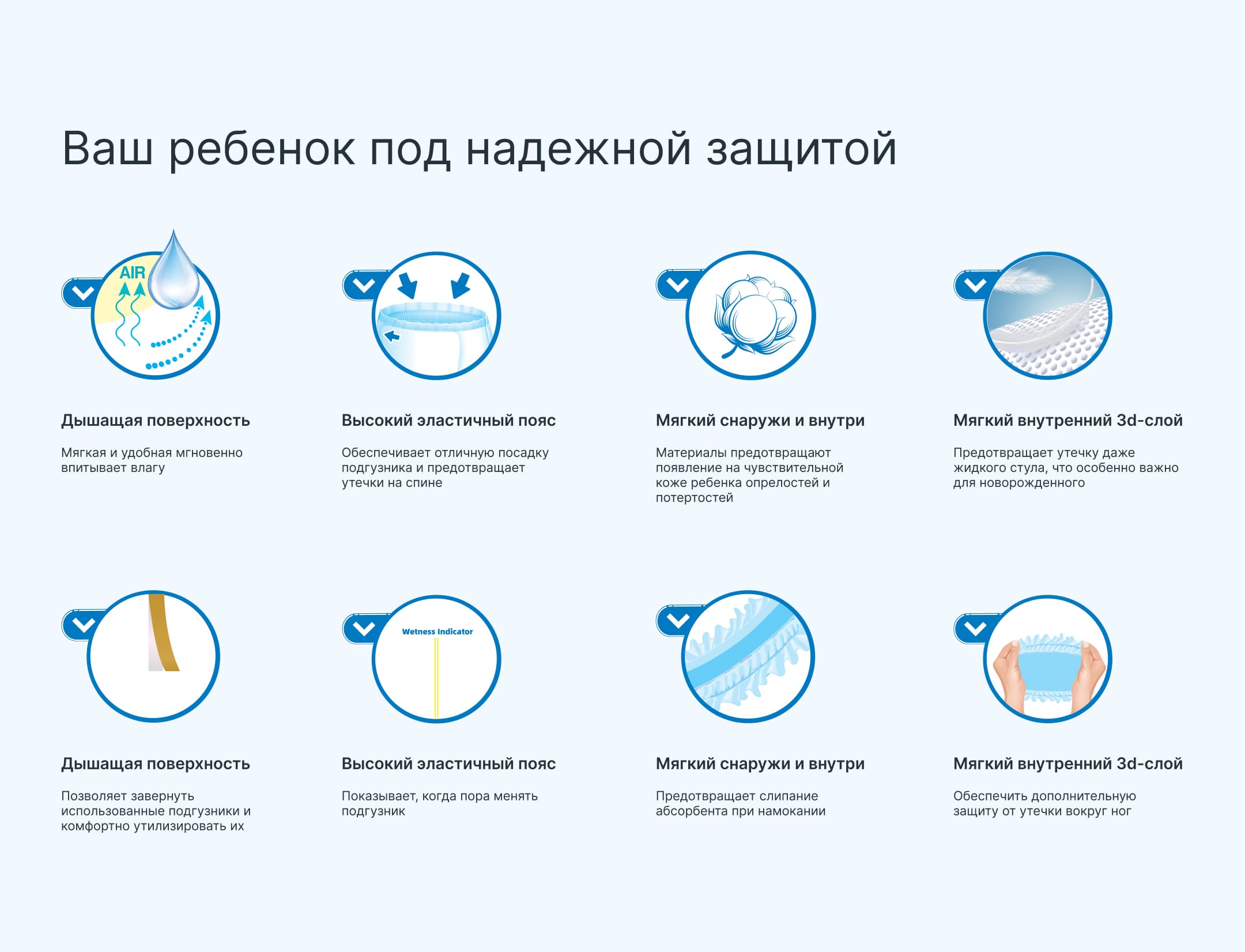 Специальный индикатор влажности подскажет о своевременной смене, застежка поможет комфортно утилизировать
