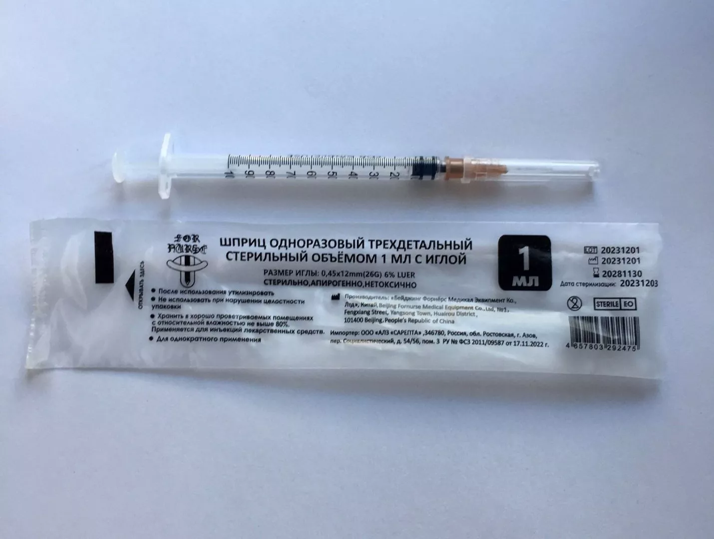 - Шприц одноразовый трехдетальный стерильный объемом 1 мл (инсулиновый) с иглой 0,45х12 мм (26G ) групповая упаковка 100 шт., транспортная упаковка 3600 шт.