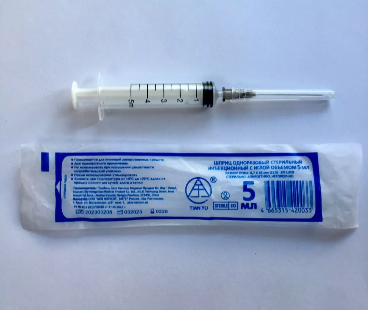 - Шприц одноразовый трехдетальный стерильный объемом 5 мл с иглой 0,7х38 мм (22G) групповая упаковка 100 шт., транспортная упаковка 1800 шт.
